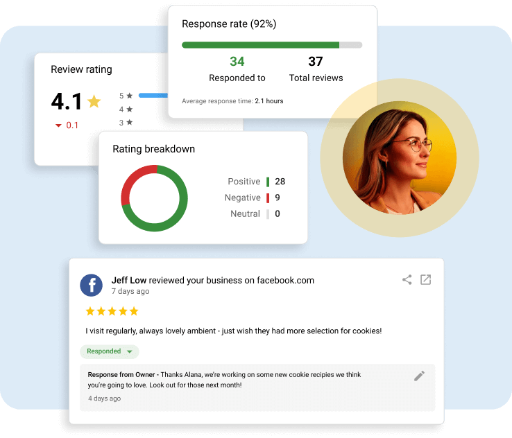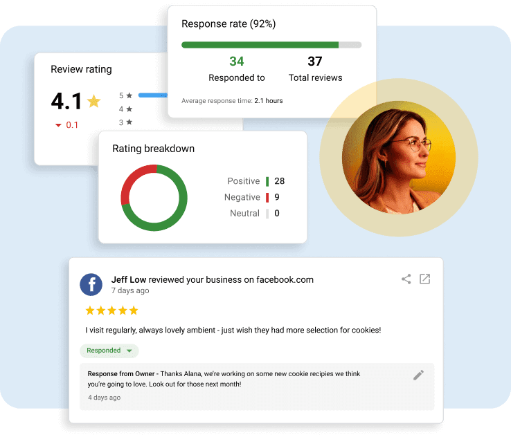Your AI Reputation Specialist crafts thoughtful responses to reviews and posts on behalf of the business and generates review requests to get more positive feedback and handle negative ones.