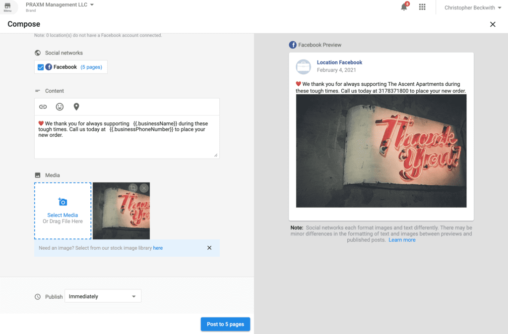 Dynamic content automatically pulls each location’s details. You can see what your post looks like in the preview pane of the composer.