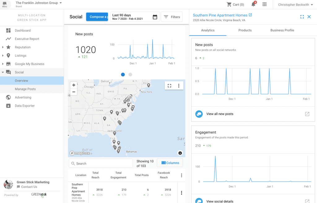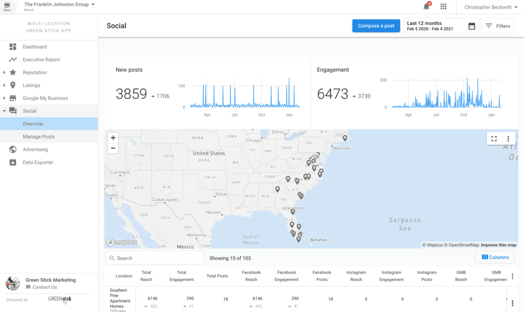 Go to Multi-Location Business App > Social > Overview. Here you will see the overview of your Brand’s social performance with details for each location. Click on the Compose Post button to open the Composer.