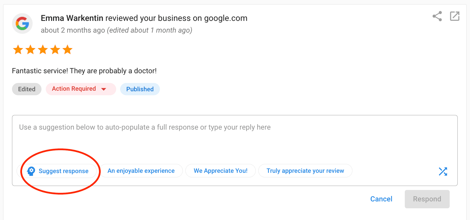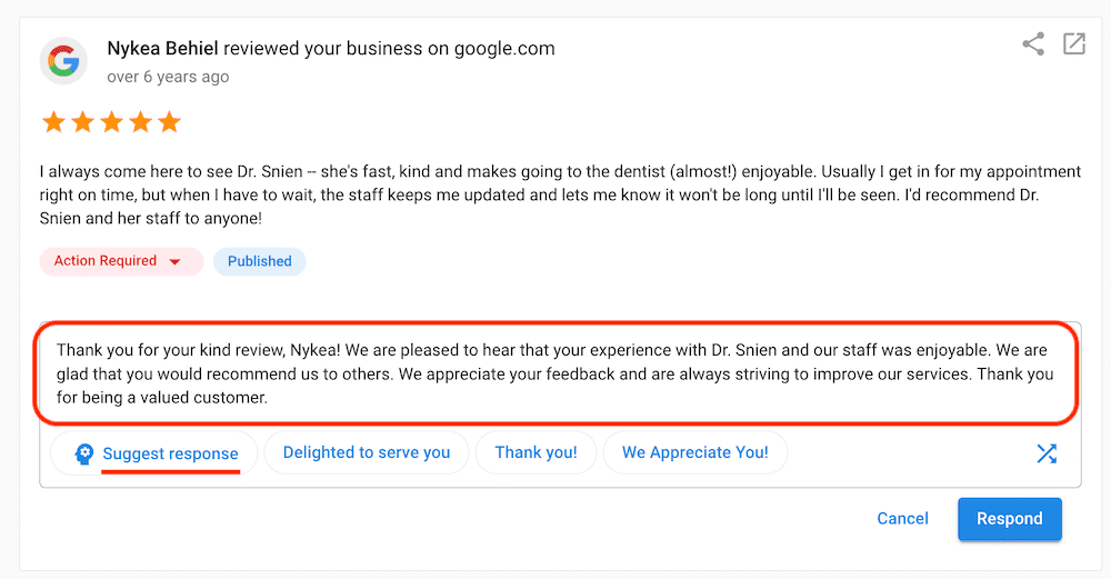 Streamlines the process when you want to respond quickly to a review on Google or Facebook to save time, improve the ease of content creation, reduce research needed, and allows you to interact with your audiences faster.