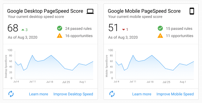 If a user clicks to Improve Desktop or Mobile Speed, they will be taken to Google’s PageSpeed Insights in another tab. From here, a user can dig into what is causing their site to receive its score and what to change to improve it. When a user clicks to Learn More, a Google article will open in a new tab informing the user why page speed is important. If the website has recently been created, the trend line will not appear as there is not enough data to support it.