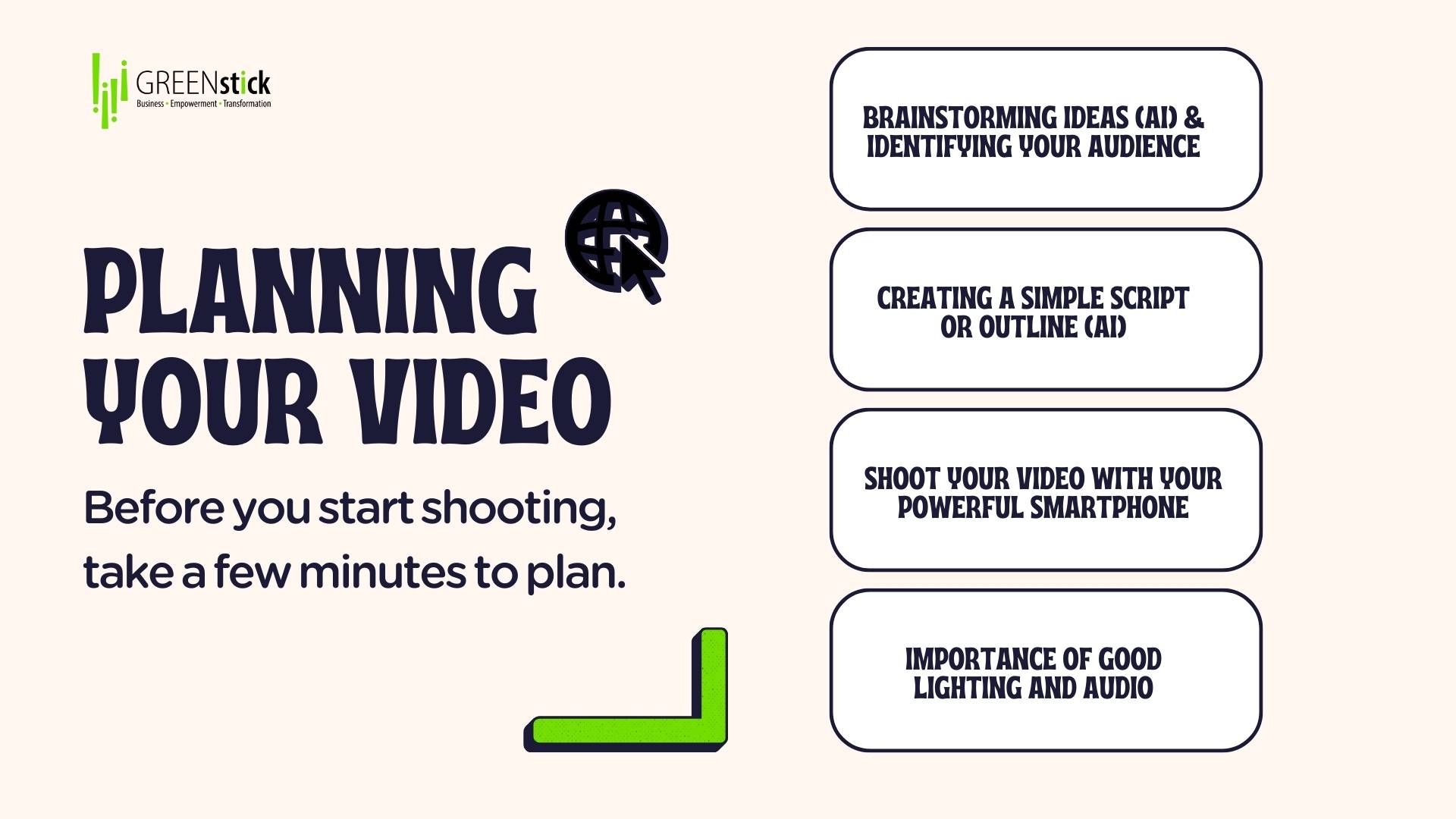 Before you start shooting, take a few minutes to plan. Consider your audience and the message you want to convey. It’s helpful to start with a simple script or outline; even a few bullet points can keep you focused.