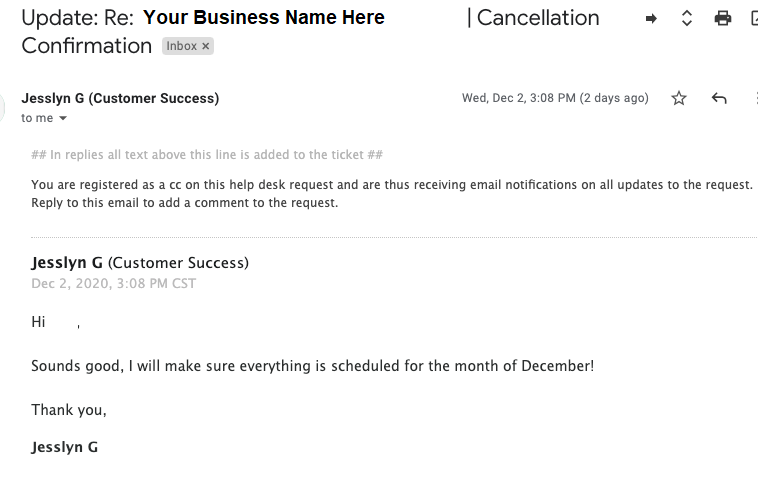 You will start to see email responses in the form of Zendesk tickets. They will look something like this: