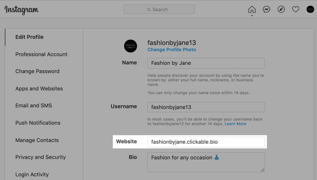 Clickable.bio URLs are formatted as “businessname.clickable.bio” (ex: fashionbyjane.clickable.bio). You can change this URL in the future.
