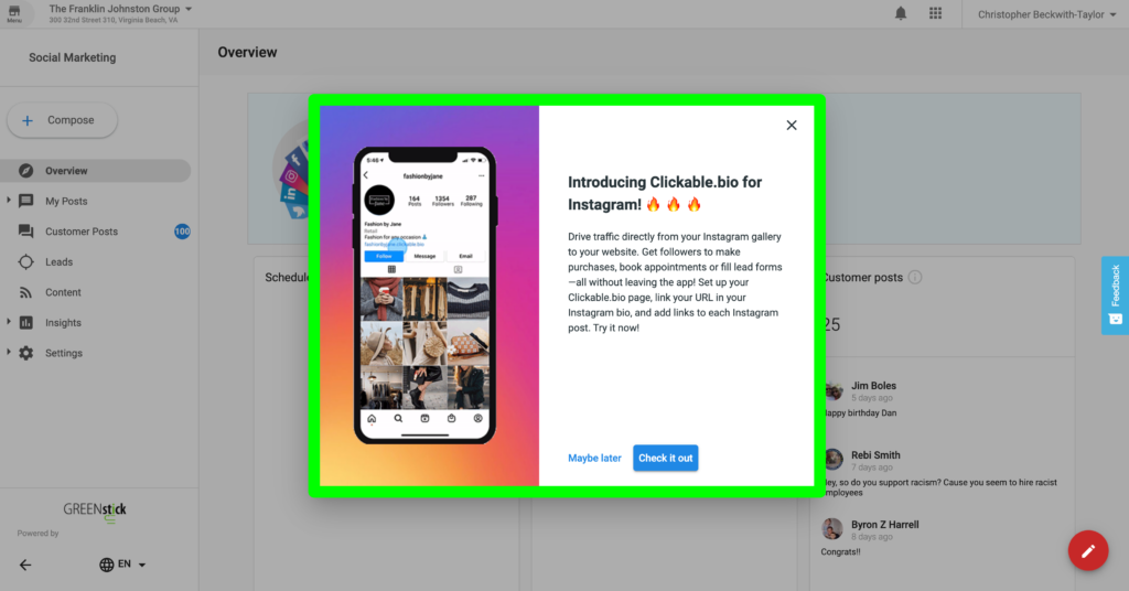 Clickable.bio transforms your Instagram posts into a shoppable gallery of images that turns social fans into paying customers. It is available for free on any Social Marketing Pro account. Just set up your Clickable. bio page in Social Marketing, link your URL in your Instagram bio, and add links to each Instagram post. Below are the detailed steps to help you get started.