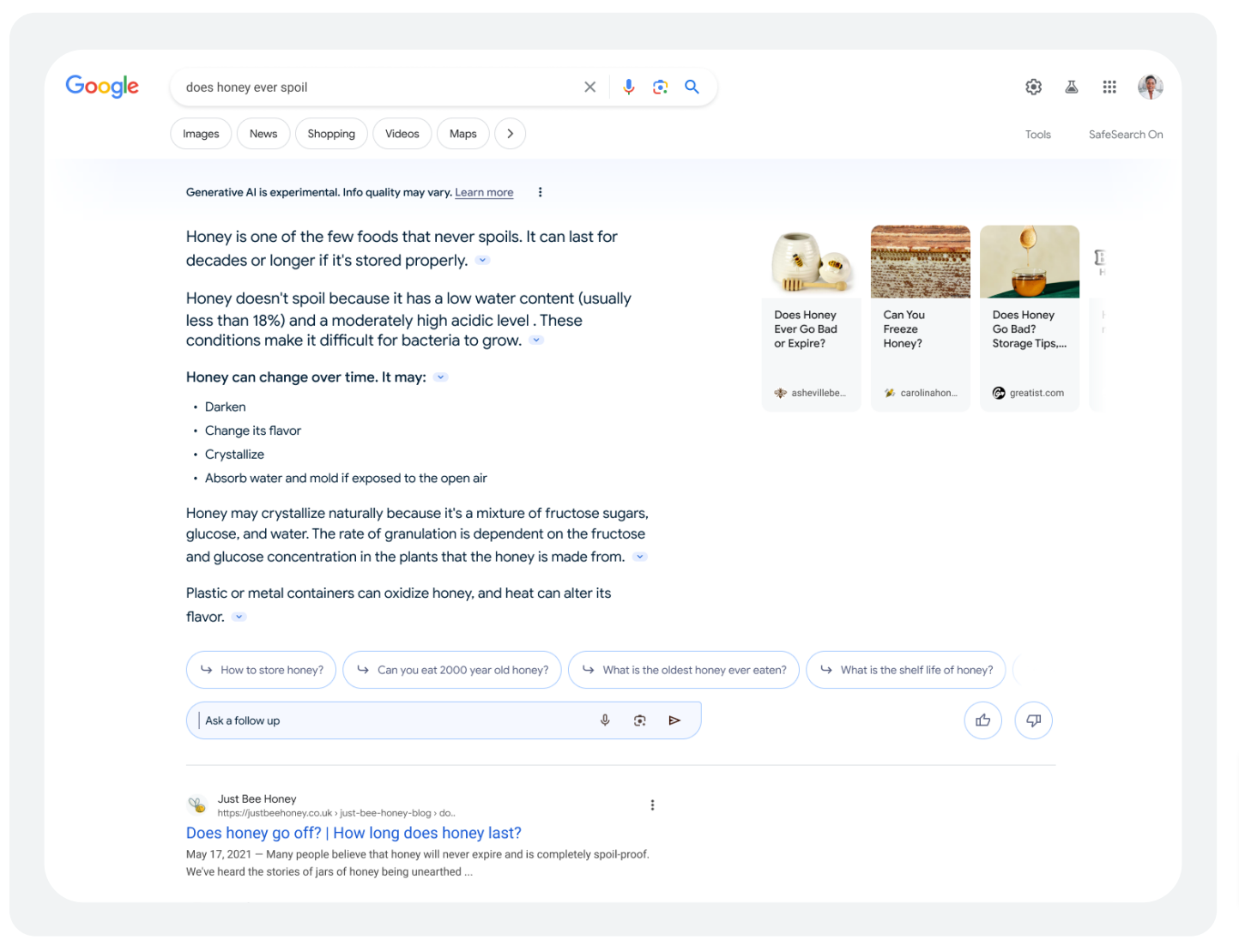 It’s still too early to have a foolproof method for optimizing content for Google’s SGE. However, prioritizing content that directly and thoroughly addresses user inquiries can help ensure relevance. This is because the AI-generated results provided by SGE still include links to relevant content and resources alongside the search results.