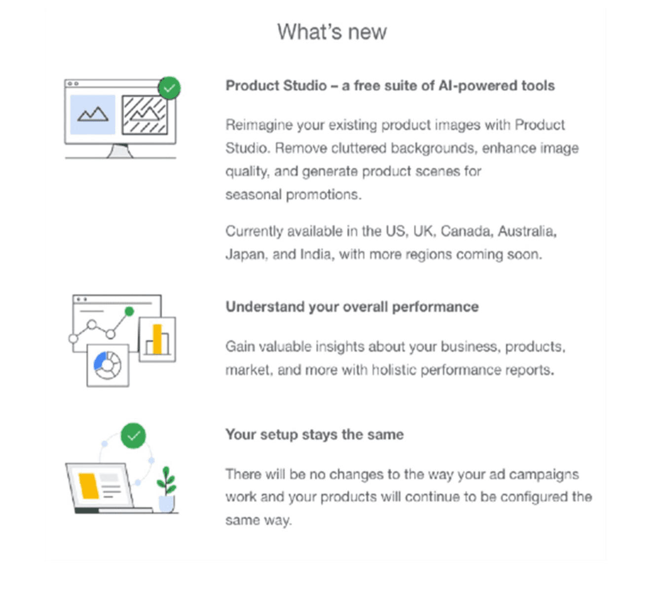 Google’s Merchant Center Next started its rollout to all merchants in July 2024. This updated version, announced at Google Marketing Live in 2023, features an AI tool called Product Studio—this tool leverages generative AI to assist businesses in creating product imagery.