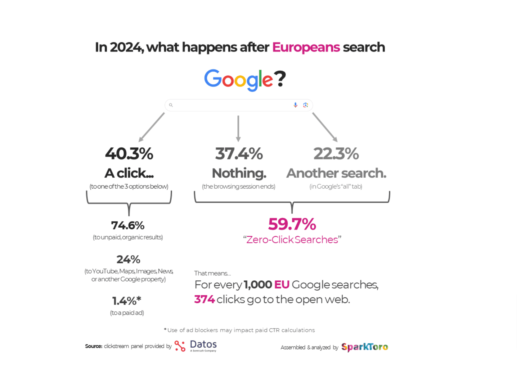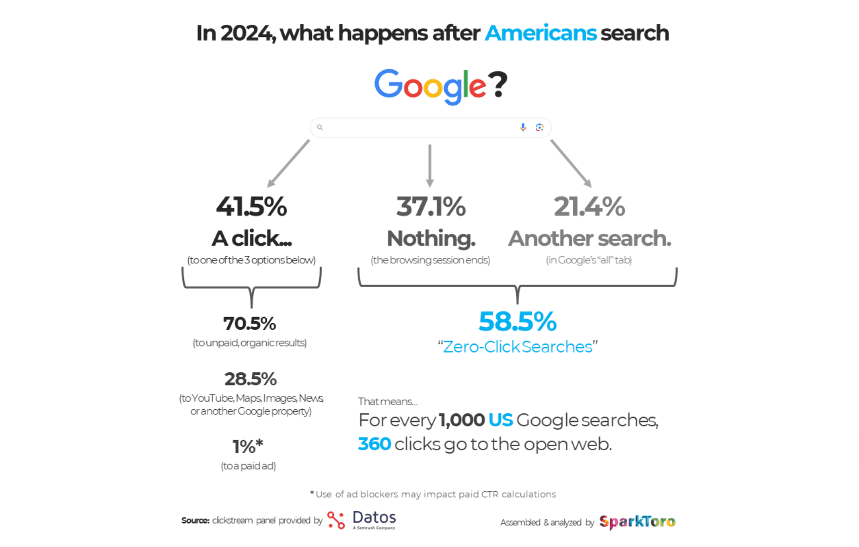 First up, Rand Fishkin’s latest SparkToro study reveals that 58.5% of US Google searches in 2024 lead to no clicks—an improvement from 65% in 2021. This means users increasingly engage with content directly on Google, making SEO strategies more crucial than ever to capture valuable traffic.