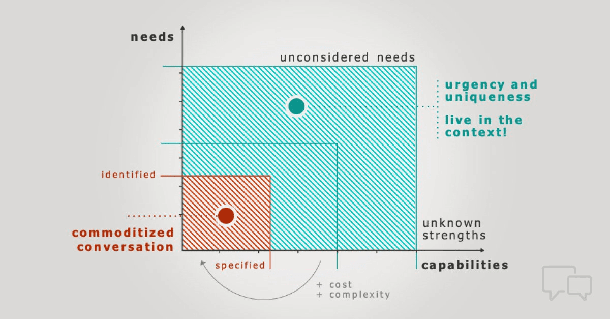 You need to open their eyes and reveal a need, a problem, a missed opportunity they don’t know they have. In psychology, persuasion is not possible without uncertainty. Exploring unconsidered needs introduces uncertainty about the way the customer does things today and the motivation to do something different.