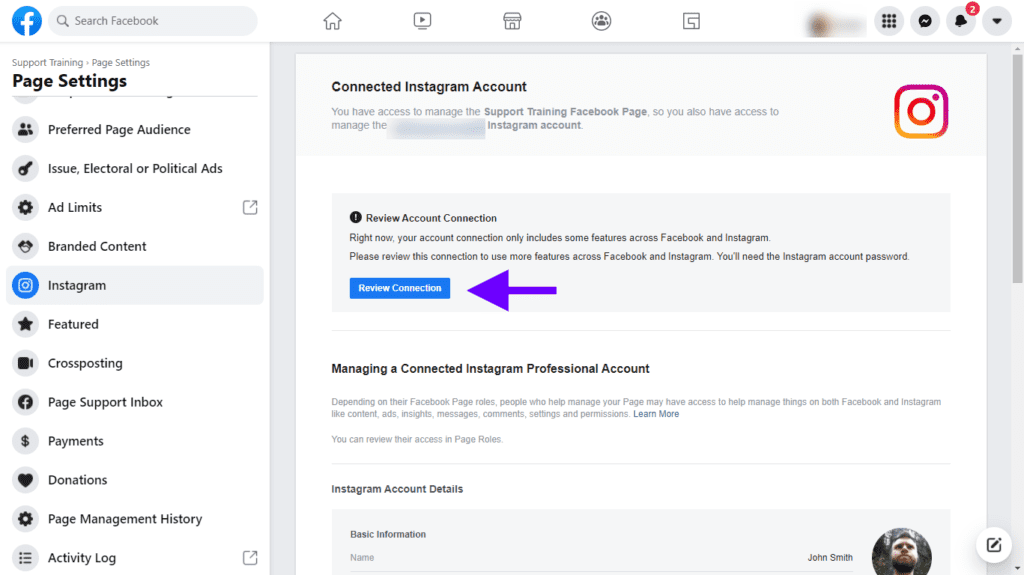When Instagram is first connected to a Facebook page, Facebook may require you to review the connection before other third-party applications can be used.