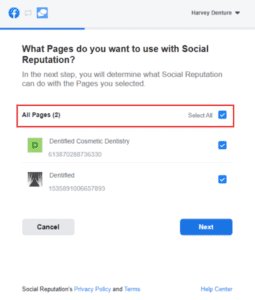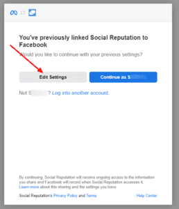 There will be an additional step as you follow the steps in Section 4. After selecting + and logging in to Facebook you will be prompted with a screen that says “You have previously linked Social Reputation to Facebook.”
