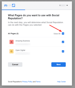Note: Make sure to select ‘All Pages’ as indicated in the screenshot below, and not just the page you want to connect to. This will not bring in all of your pages, however, it is required for the API to successfully connect.