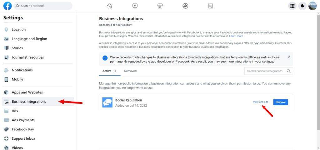 - Go to Facebook > Click on your Profile Picture> Settings & Privacy > Settings > Business Integrations > View and Edit