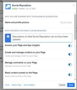 3. Continue with the remaining connection steps by ensuring that Social Reputation is given all permissions, click Done, and then OK to be redirected back into the product to complete the connection.