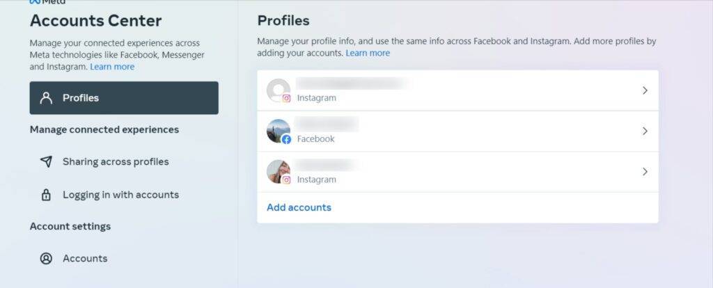 - Select Settings > scroll down to Meta Accounts Center