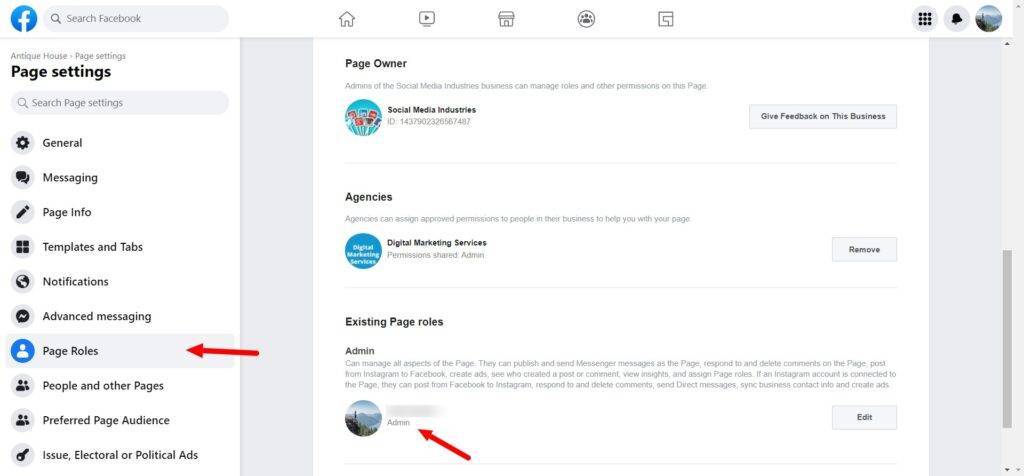 - Next, click on Page Roles. Scroll down to the bottom of the page where it says “Existing Page Roles”. Ensure your user is there, and the role assigned to you is “Admin“. There are other Facebook page roles like “Moderator” or “Editor”, but you will need to be an Admin to properly connect and post to the account. If you cannot find it, or if you are unable to access this page, you’ll need to reach out to have another admin grant you an admin role, or contact the owner of the page.