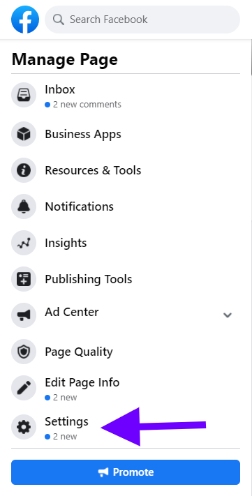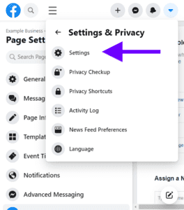 - From the business page on Facebook, click Settings